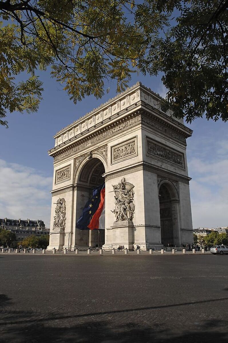 Drapeaux français et européen flottant sous l'Arc de triomphe de l'Étoile (framed canvas)