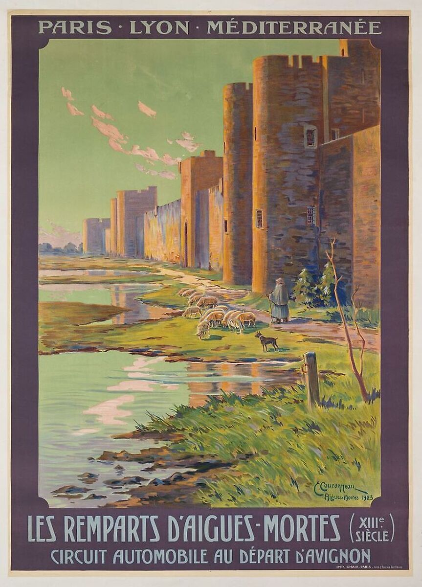 1923 - 1er quart du 20e siècle - Troisième République (1870-1940) lithographie - papier Original work by: Couronneau, Ernest (18..-19..) Couronneau, Ernest (18..-19..) - Les Remparts d'Aigues-Mortes (XIIIe siècle). Circuit automobile au départ d'Avignon - © Reproduction Benjamin Gavaudo - CMN