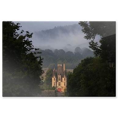 Château de Carrouges, castelet d'entrée dans la brume matinale (aluminium panels)