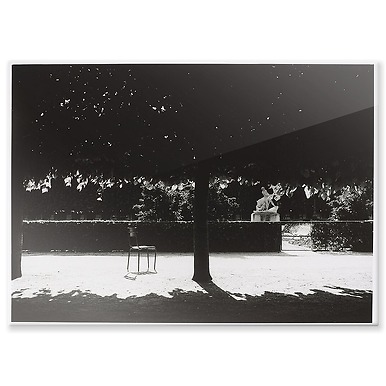 Jardin du Palais-Royal, allée de tilleuls, chaise et groupe sculpté (aluminium panels)