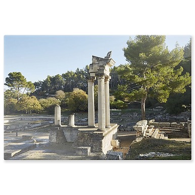 Site archéologique de Glanum, centre monumental, le petit temple géminé du forum (aluminium panels)