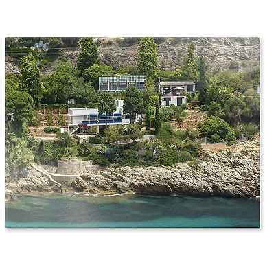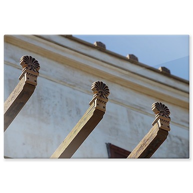Villa Kérylos, façade est, antéfixes surmontant la terrasse de la bibliothèque (aluminium panels)