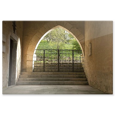 Abbaye de Charroux, passage entre le chauffoir et la salle capitulaire (aluminium panels)