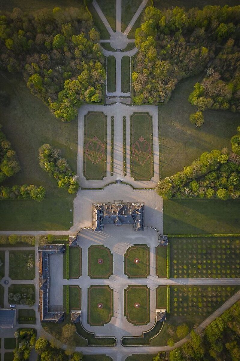 Château de La Motte-Tilly et son jardin, vue aérienne au coucher du soleil (affiches d'art)
