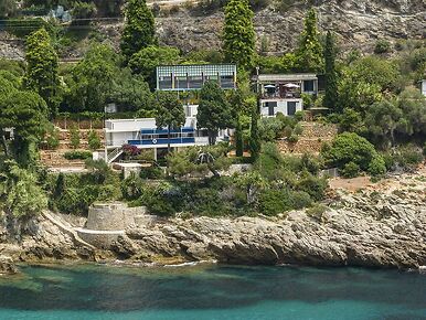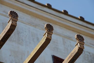 Villa Kérylos, façade est, antéfixes surmontant la terrasse de la bibliothèque (affiches d'art)