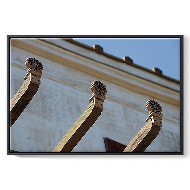Villa Kérylos, façade est, antéfixes surmontant la terrasse de la bibliothèque (toiles encadrées)