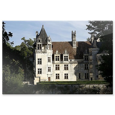 Château de Puyguilhem, façade principale du grand logis Renaissance avec, à gauche, la tour d'escalier (panneaux aluminium)